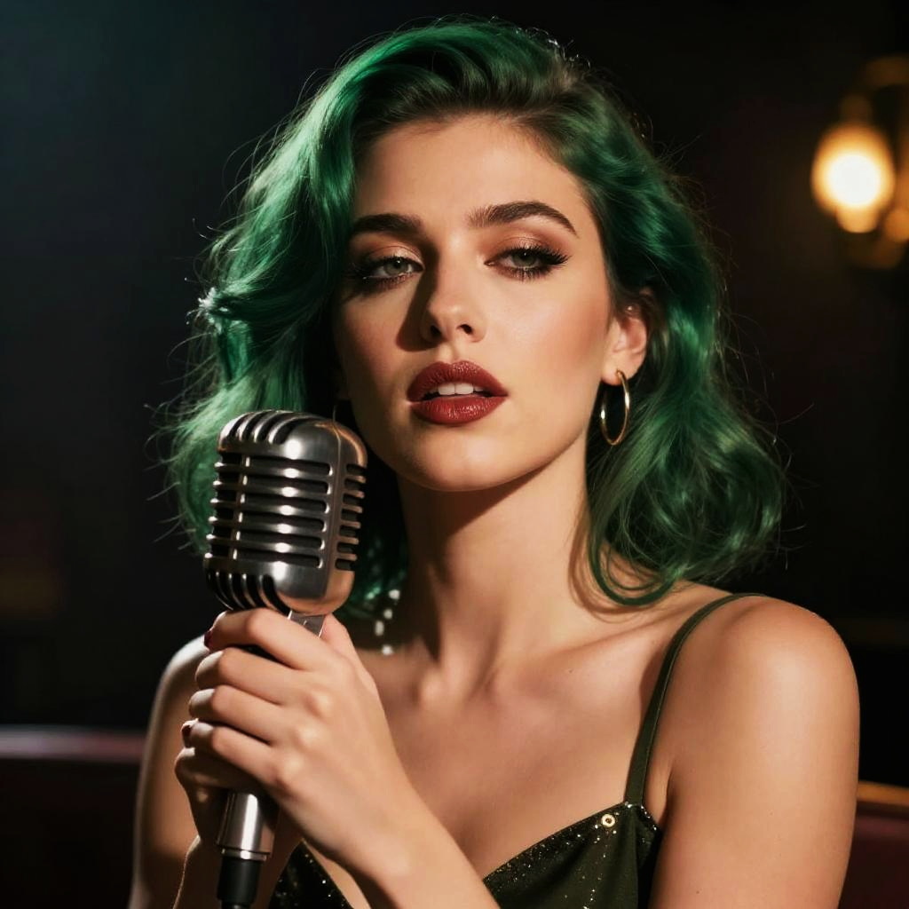 Close-up portrait of a female singer with green hair holding a vintage microphone, dramatic shadows, smoky jazz club atmosphere, rich textures and deep colors