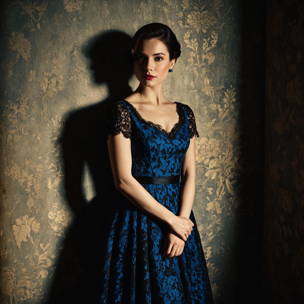 A striking woman stands against a textured, aged wall in a dramatic lighting setting, wearing a long, flowing deep red dress with a high slit and fitted bodice, accessorized with a bold necklace and knee-high lace-up boots, exuding confident and mysterious vintage glamour with dark moody atmosphere and rich red color