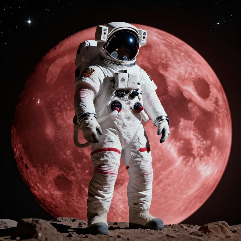 An atmospheric suit prompts concept of a lone astronaut in a breathable, self-regulating space suit standing on the edge of a crimson moon, stars swirling in the background, soft cinematic lighting, deep space environment, detailed fabric and material textures, Flux style.