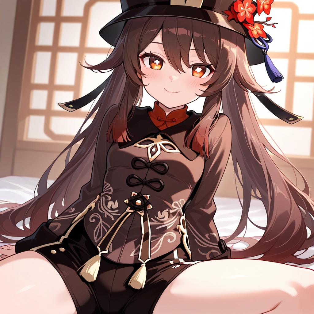 Masterpiece, best quality, 1girl, hu tao (genshin impact), hat, red eyes, twintails, brown hair, solo, symbol-shaped pupils, long hair, bangs, official outfit, shorts, china dress