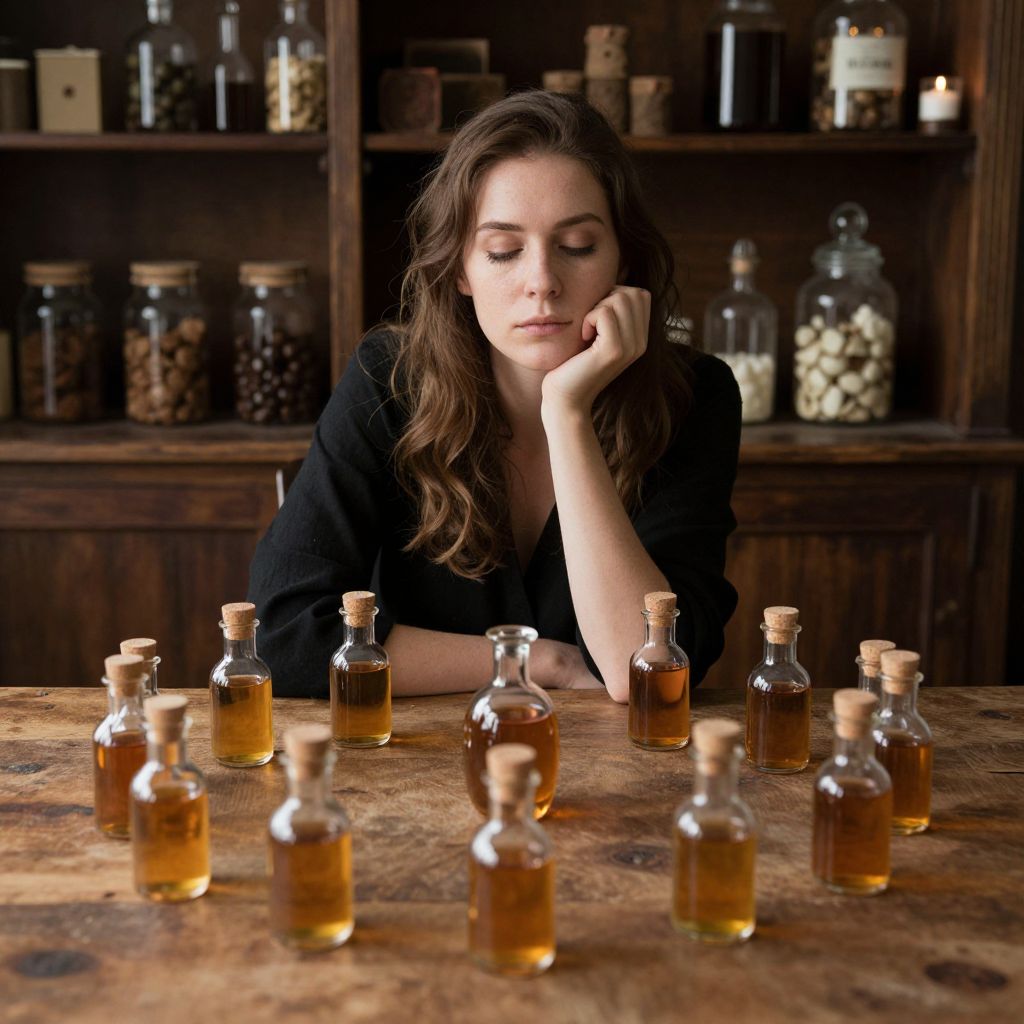 Photograph of a young woman with long, wavy brown hair and fair skin, wearing a black blouse, sitting at a wooden table. She rests her chin on her hand, gazing thoughtfully at a row of small, glass bottles filled with amber liquid, each with a cork stopper. The background features dark wooden shelves filled with jars of various contents, including nuts and grains. The warm, dim lighting casts soft shadows, creating a rustic and contemplative atmosphere. The woman's expression is serene and introspective.