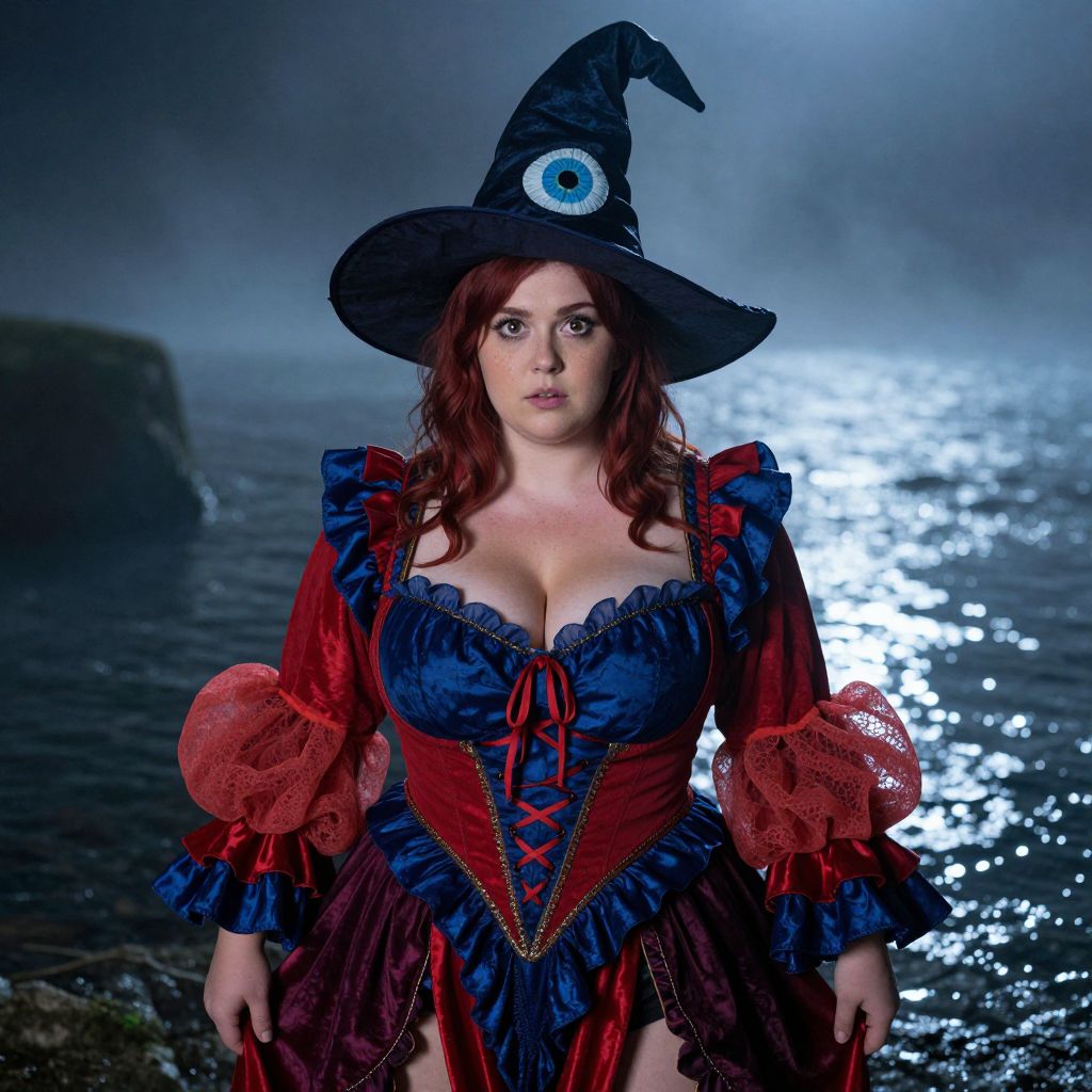 A cinematic shot of a plus-size woman in a full sea witch costume—red and deep blue ruffled garments, large sea-sponge-like sleeves, and a witch’s hat with a glowing blue eye detail—standing in a foggy cove at night. Her face is clearly visible: fair skin, wide brown eyes, soft freckles, and an expression of calm authority. The ocean glistens with moonlight, and the costume's textures reflect realistic fabric details with attention to volume and movement.. The woman has big tits and cute face