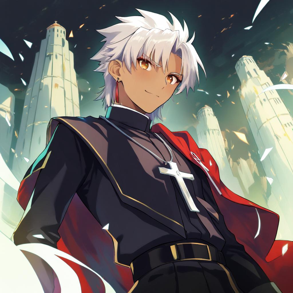 Digital anime-style illustration of a dark-skinned male character with white short hair and yellow-brown eyes. He wears a black priest outfit with a large silver cross necklace and a red cape. The character has earrings and stands confidently against a background of tall white towers and a dynamic sky with floating shards of light. The image is inspired by the Fate series character Amakusa Shirou.