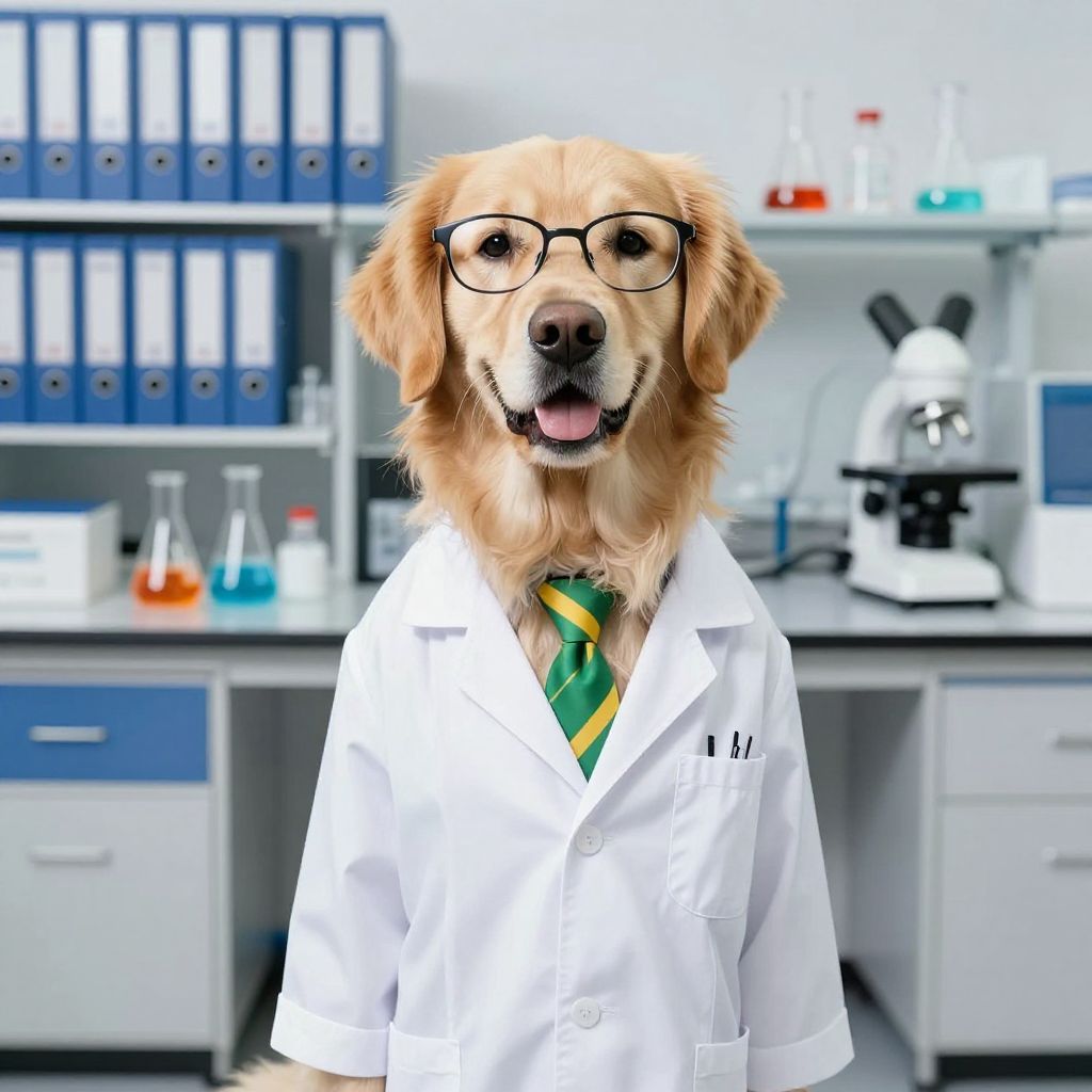 Photograph of a golden retriever wearing black glasses, white lab coat, and green-yellow tie, standing in a modern laboratory with shelves of blue bind