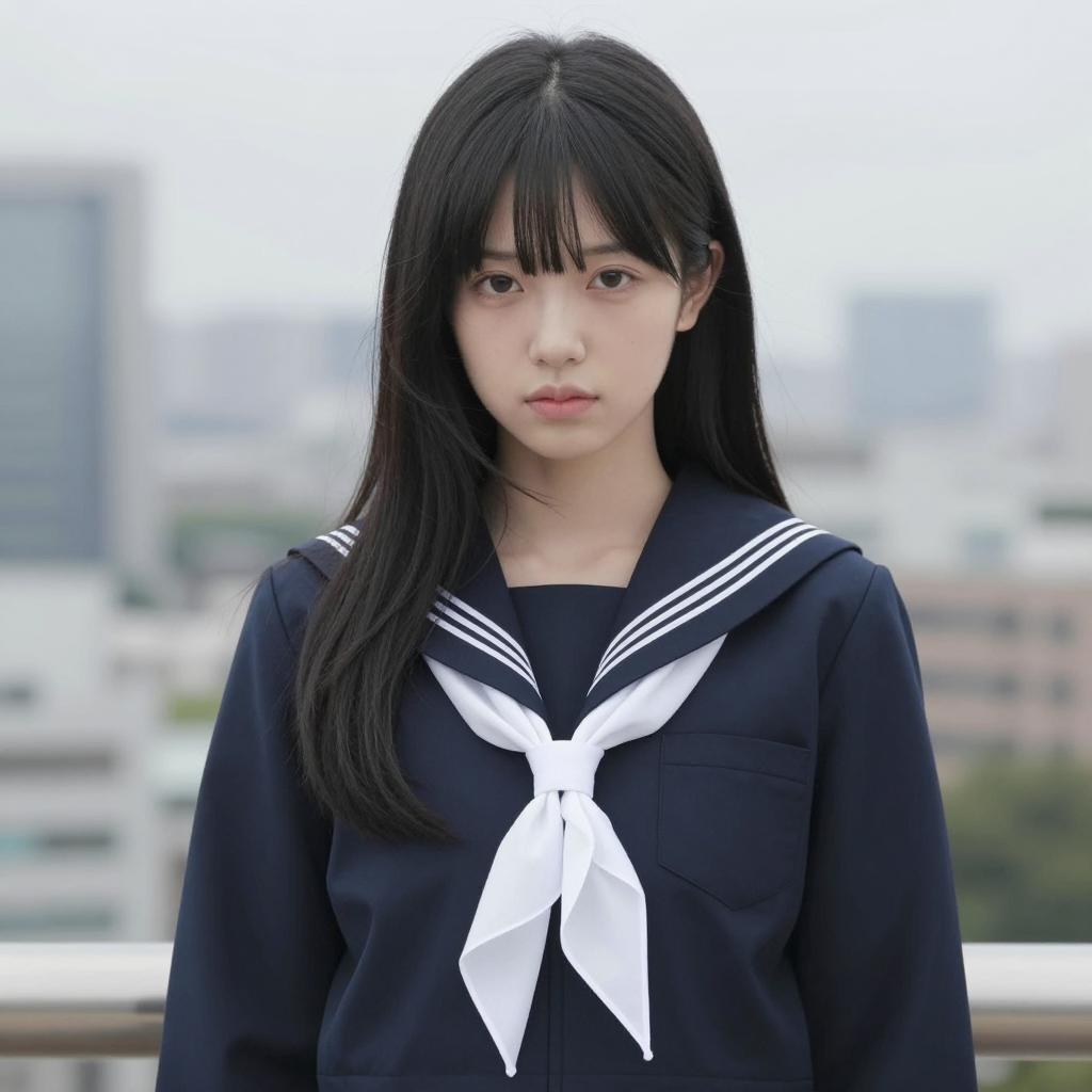 Asian woman with long black hair, standing against wooden wall, wearing navy blue sailor school uniform, black knee socks, holding katana across chest. Arms crossed. Serious expression. Wooden background. Textured wooden door on right. Full body shot. Photographic style.