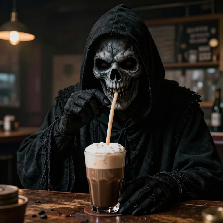 Wide-Angle Shot photorealistic shot of the grim reaper beer bonging coffee, highly realistic, intircate detail, cinematic lighting,