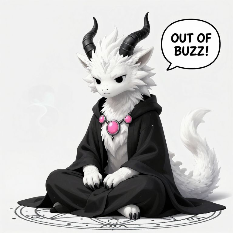 Digital drawing of a cute, white, fluffy dragon-like creature with black horns and black eyes, sitting cross-legged on a black magic circle. It wears a black hooded robe with pink gemstones on a necklace. The creature has a speech bubble saying "OUT OF BUZZ!" in bold black letters. The background is white, making the character and magic circle stand out. The style is clean and cartoonish with a mix of soft and bold lines.