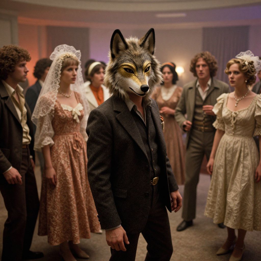 In this surrealistic, dark fantasy movie scene, a man dons a wolf mask, standing out amidst a gathering of figures in a ballroom setting. The scene is reminiscent of Jodorowsky's \"The Holy Mountain,\" with its dramatic and ethereal atmosphere. The man's wolf mask, adorned with fur and gold accents, is the focal point, drawing attention to his presence. The background features a group of people, some in elaborate, retro-style dresses with veils and laces, while others are dressed in more subdued, rustic attire. The lighting is soft and diffused, casting a warm, vintage glow over the scene, enhanced by the technicolor hues. The overall composition is dynamic, with figures positioned in various poses, some in the foreground and others in the background, creating a sense of depth and movement. The scene is captured with a medium format, 120 film camera style, adding to the nostalgic, 1970s fashion aesthetic. The soft blur and relaxed poses contribute to the dreamlike quality of the image, blending reality with the fantastical elements of the scene.