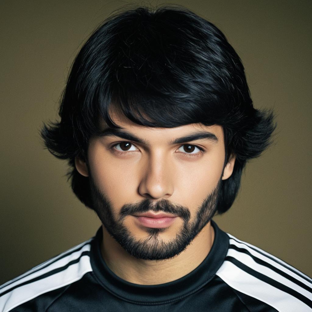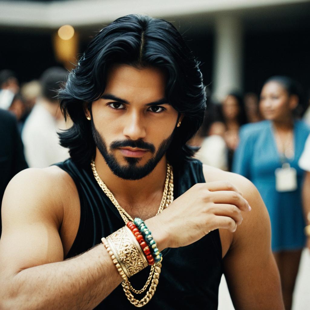 Portrait of a confident young man with medium-length black hair and well-groomed facial hair. He is wearing a sleeveless black top and multiple gold and beaded bracelets and chains. The background is blurred, featuring indistinct figures in semi-formal attire.