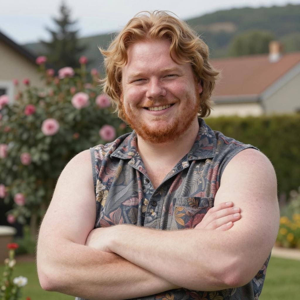 A smiling, overweight man with medium-length, reddish-blonde hair. He wears a sleeveless, patterned shirt. Background includes green bushes with pink flowers, a house, and a hill with trees. He stands outdoors with arms crossed. Bright daylight.