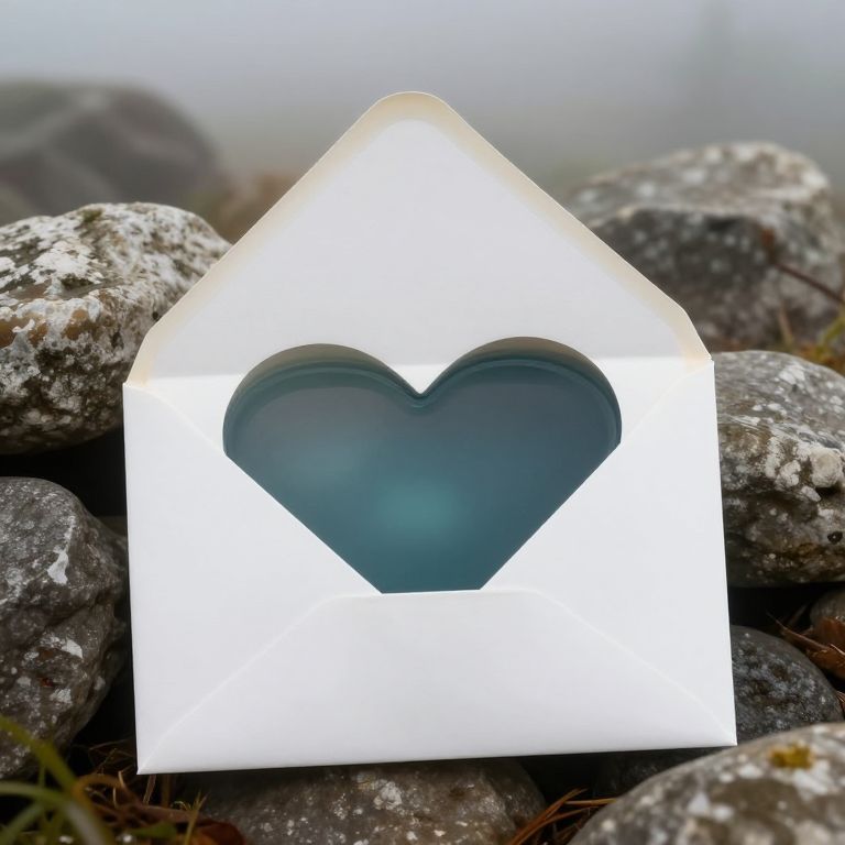 Photograph of a white, triangular-shaped card with a large, blue heart cutout in the center, placed atop a pile of gray, moss-covered rocks. The card's edges are slightly translucent, with a soft gradient from white to a light cream at the top. The background is blurred, featuring a misty, foggy forest with indistinct greenery. The rocks have a rough texture with visible moss and small plants. The overall composition has a serene, natural feel, with the stark white card contrasting sharply against the earthy tones of the rocks and the misty background.