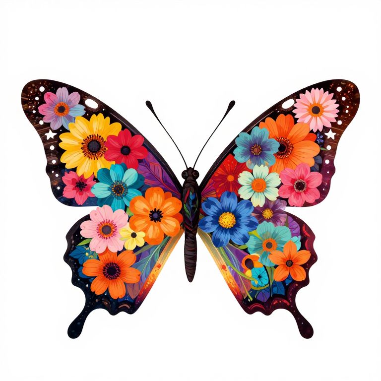 Modern Art a beautiful butterfly made of colorful flowers in detailed drawing style + simple vector + bright colors on a white background,