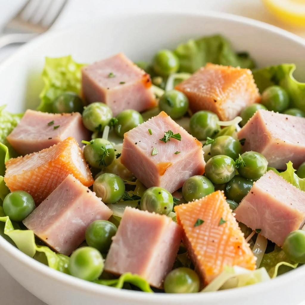 This is a close-up photo of a colorful salad in a white bowl. The salad includes chunks of pink ham, orange fish, green peas, and shredded lettuce, all mixed together. Fresh green herbs are sprinkled on top, adding a pop of color. The background is softly blurred, focusing attention on the vibrant, fresh ingredients. The image has a bright, cheerful feel.
