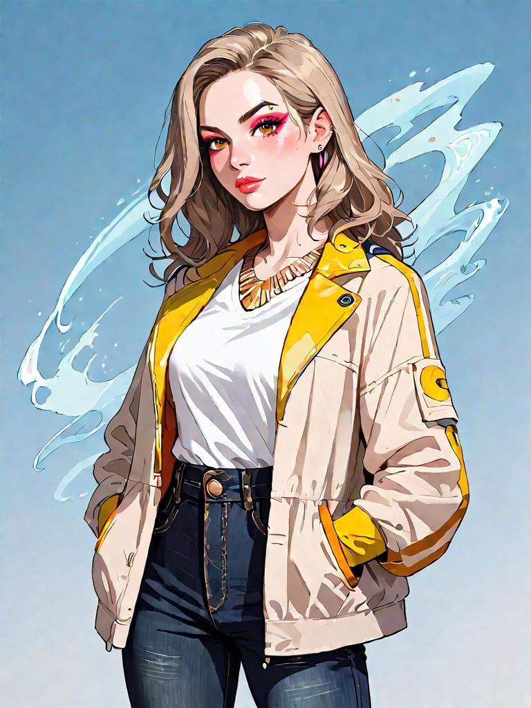 1girl, source_comics, realistic face, full body shot, Woman, casual chic, white moto jacket, asymmetrical zip, textured panels, paired with a light beige scoop-neck top, high-rise black skinny jeans, gold layered necklaces, styled with loose waves.