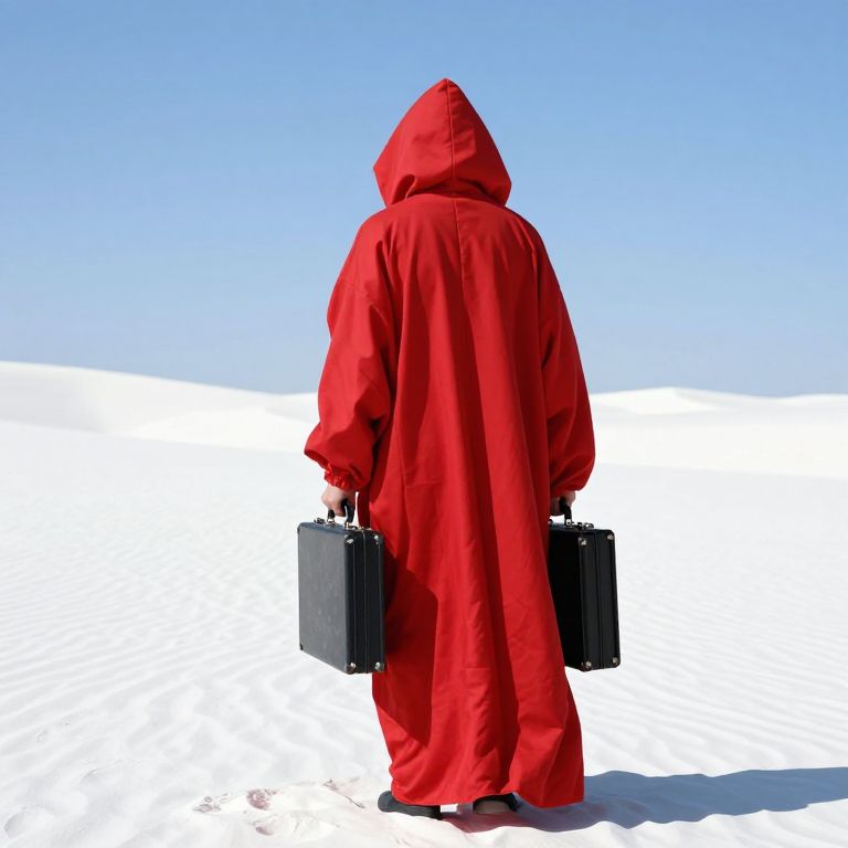 Impressionism, very smooth, from behind, back of a person in a bright red mantle, mantle is very baggy, huge hanging sleeves, standing in a completely white desert, white sand, the sky is smooth blue, holding a black briefcase