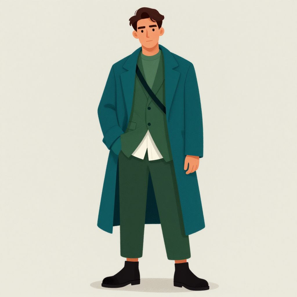 This is a digital illustration of a young man with fair skin and dark brown, wavy hair. He stands confidently against a plain white background. He wears a long, dark teal overcoat that reaches his knees, a dark green shirt with a black diagonal satchel crossing his chest, and dark green pants that are slightly cropped above the ankles. His shoes are black with visible white soles. His right hand is in his coat pocket, and his left arm hangs naturally by his side. The style is clean and modern, with bold colors and simple, smooth lines.