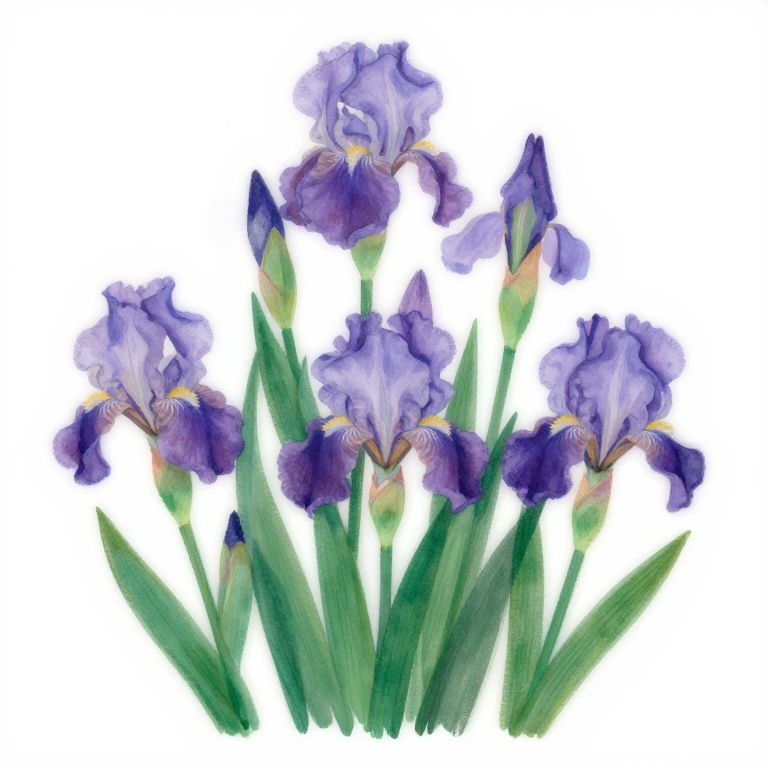 A bright watercolor illustration featuring purple iris flowers with green stems and leaves. The artwork has a simple monochrome white background that emphasizes the vivid colors of the flowers. Styled with soft, flowing brushstrokes reminiscent of Henri Matisse's expressive techniques, the composition follows the rule of thirds and presents a clear, balanced floral arrangement.