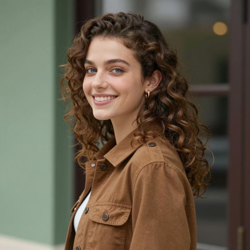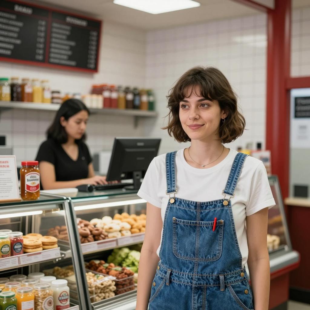 A woman with short brown hair, white t-shirt, and blue denim overalls with a red pen in the pocket, standing in a dimly lit deli. She has a slight smile and looks to the side. In the background, two women, one with long black hair, wearing a black top, stand behind the counter. Shelves with food items and a menu board with are visible. One woman at the counter is focused on a computer. The setting has a white tiled wall and red columns.