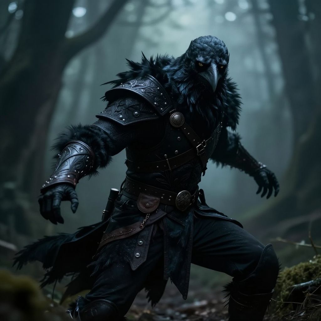 Crow DnD character, dark fantasy rogue with black feathers, intricate leather armor, glowing eyes, misty forest background, cinematic lighting, dynamic pose