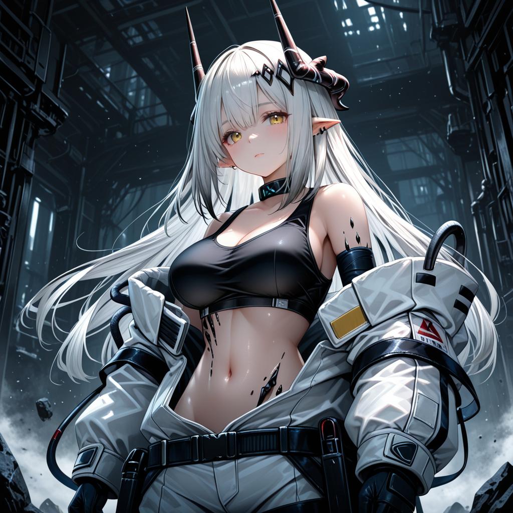 Mudrock (elite ii) (arknights), arknights, 1girl, pointy ears, horns, ear piercing, red eyes, hair between eyes, long hair, white hair, grey hair, hair ornament, large breasts, cleavage, navel, black sports bra, black gloves, bare shoulders, off shoulder, long sleeves, black choker, oripathy lesion (arknights), material growth, infection monitor (arknights), crop top, midriff, stomach, by artist ryosios, dark_illustrious