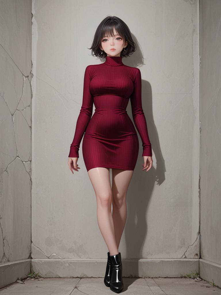 1girl, realistic face, full body shot, Woman, contemporary chic, burgundy off-the-shoulder bodysuit with a high neck and long sleeves, paired with a black faux leather mini skirt, diagonal zipper detail, high waistline, plain beige photo studio background.