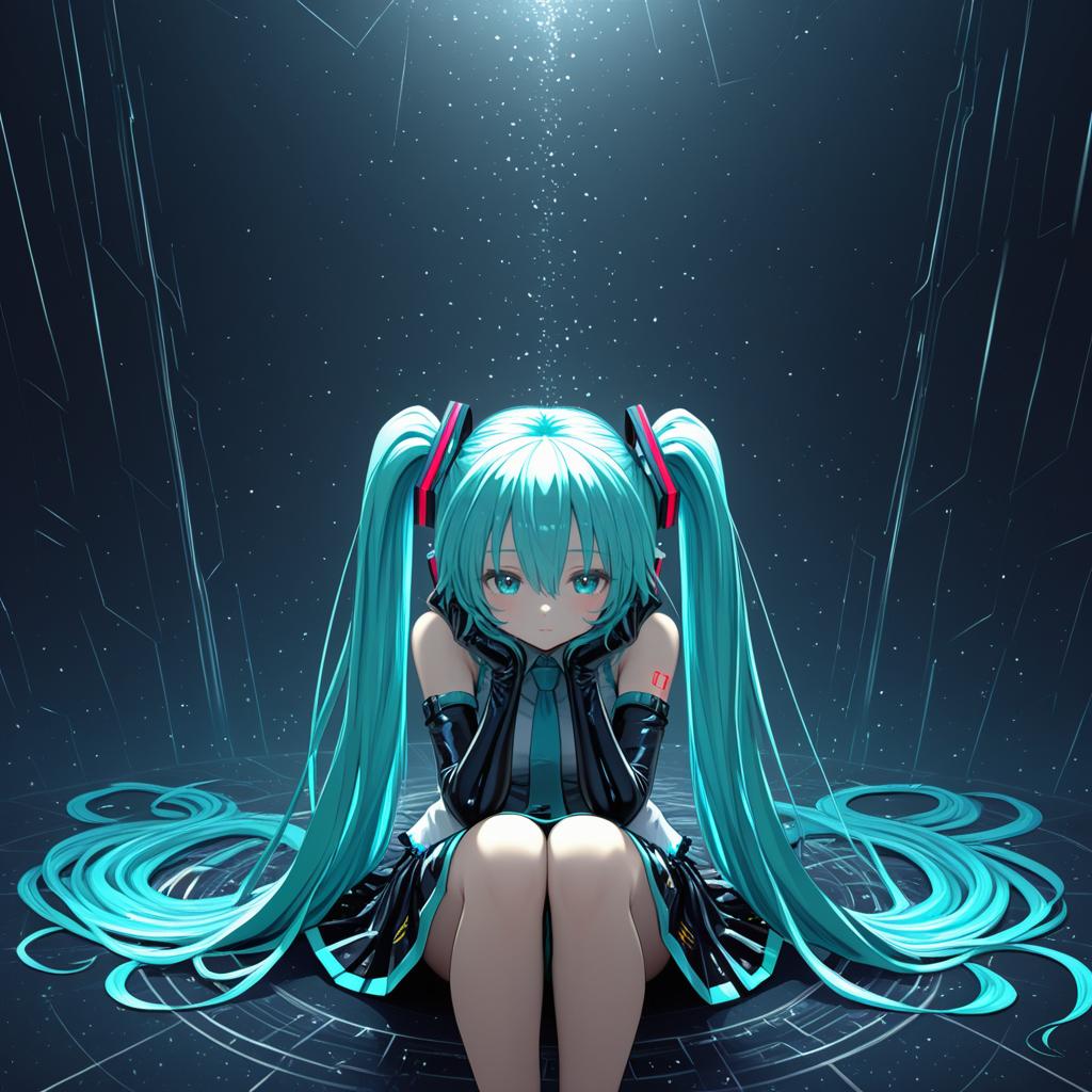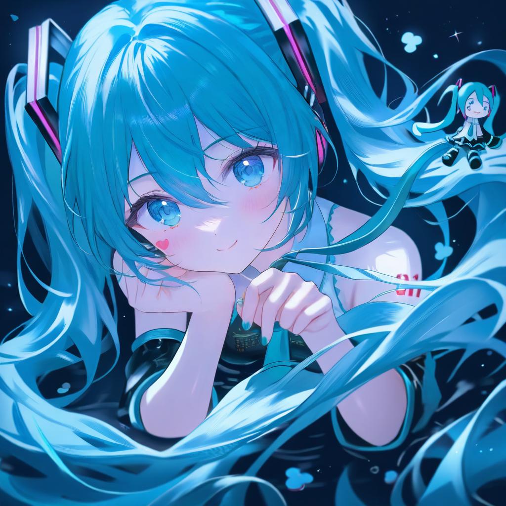 Hachune miku, vocaloid, 1girl, aqua eyes, aqua hair, very long hair, long hair, twintails, by artist salamander (hop-step), dark_illustrious