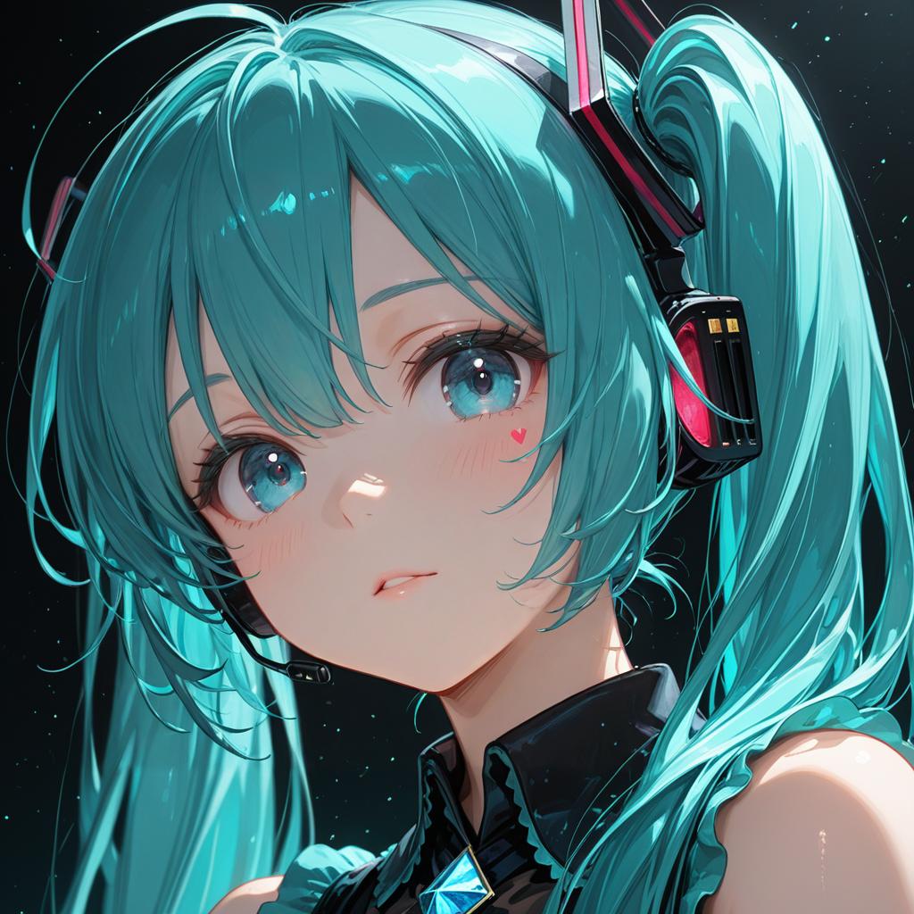 Digital illustration of Hatsune Miku, a popular Vocaloid character, featuring aqua blue twin-tailed hair, large aqua eyes, and a black headset with red accents. The character wears a dark outfit with a gemstone brooch, rendered in a highly detailed anime style against a dark, starry background.