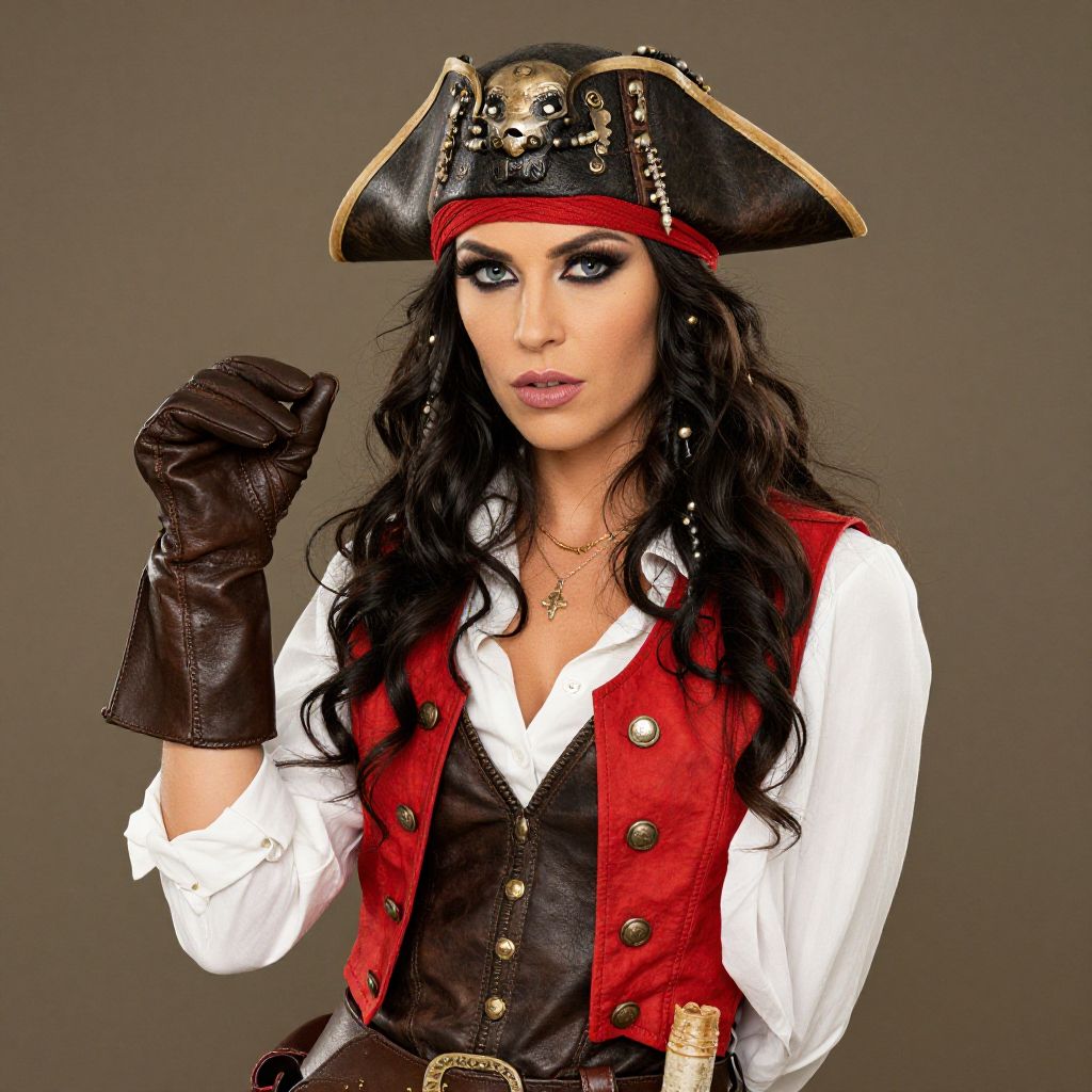 Photograph of a woman dressed as a pirate. She has long, wavy black hair, heavy eye makeup, and wears a black tricorn hat with a skull and crossbones emblem. Her outfit includes a red and black vest over a white shirt, black leather gloves, and a black corset. She has a gold necklace and her right hand is raised in a fist. The background is a solid, muted brown. The image has a digital, stylized look with vivid colors and sharp contrasts. The woman's expression is confident and slightly seductive.