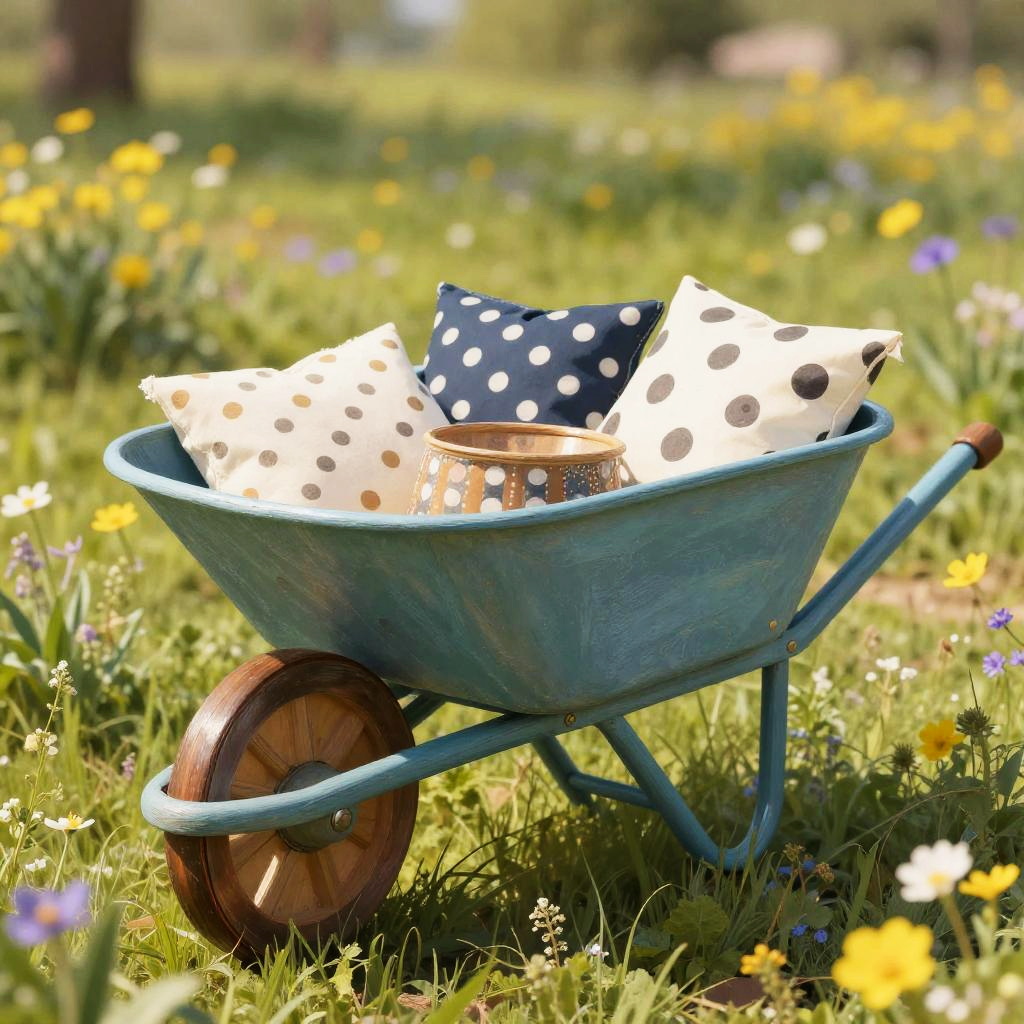 Textile garage sale trash polka art, sunny wildflower meadow, painted wooden wheelbarrow, Spring