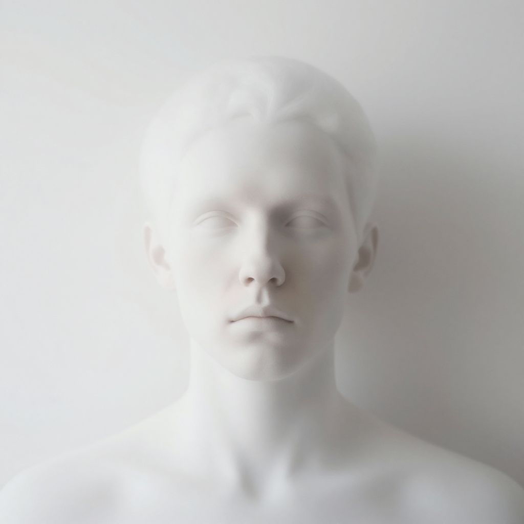Photograph of a white, androgynous figure with a blurred, white light obscuring half the face, against a minimalistic, white background