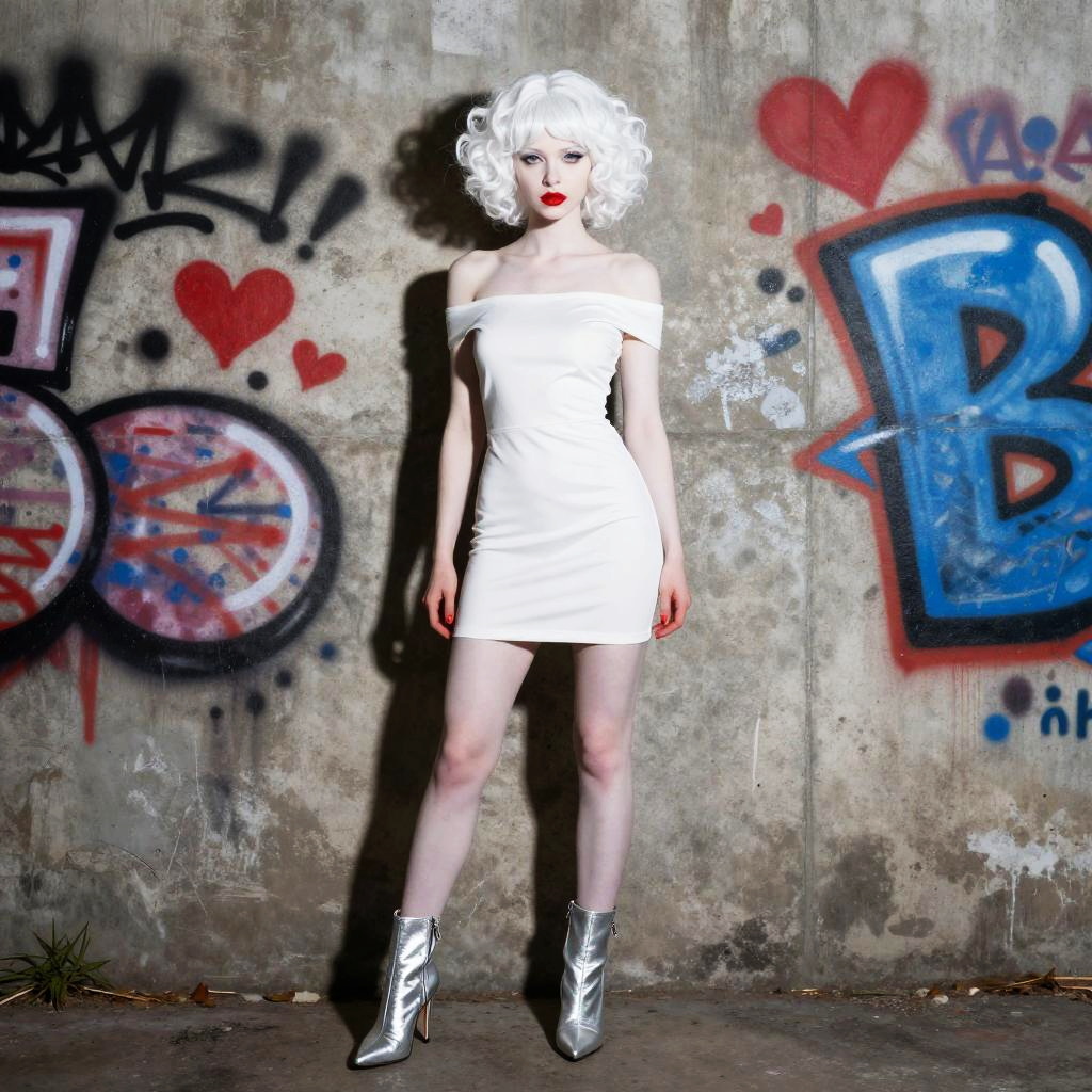 Photograph of a pale-skinned woman with white, curly, short hair and bright red lipstick standing against a graffiti-covered concrete wall. She's wearing a tight, off-the-shoulder, white mini dress and silver high-heeled boots. The background features colorful graffiti including red hearts and blue letters. Her confident pose and bold outfit contrast with the urban, gritty setting.