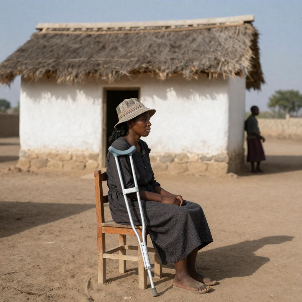 Photograph of a rural scene. A woman with dark skin, wearing a patterned hat and dark dress, sits on a simple wooden chair with crutches. Background: white-washed hut with thatched roof, stone walls, another person in shadows. Dry, dusty ground.