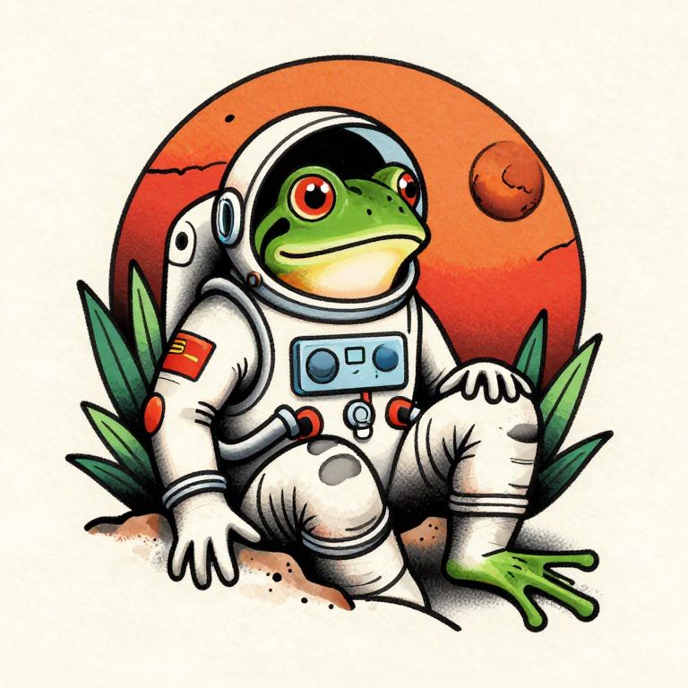 Old school, traditional style tattoo sketch of frog in a space suit in front of the mars drawn by sailor jerry, vic james, electric martina, heath clifford, kimi vera