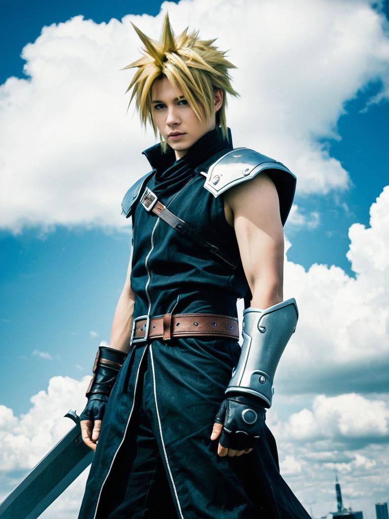 Portrait of a man in a detailed and realistic Cloud Strife cosplay costume from Final Fantasy, featuring spiky blond hair, blue outfit with leather straps, and metallic shoulder armor, holding a sword on his back, against an outdoor cloudy background.
