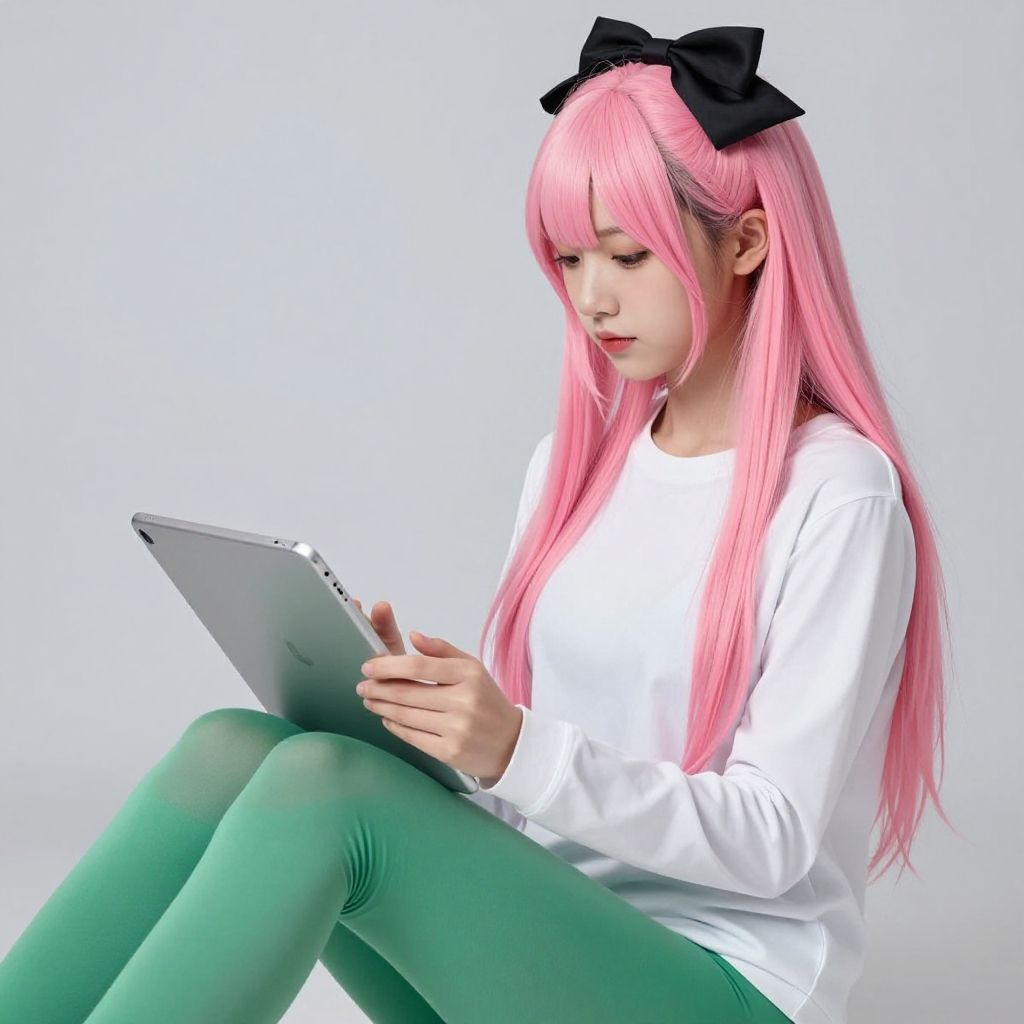 This is a digital CGI image of a young woman with long, straight pink hair, wearing a black bow headband and a white long-sleeve shirt. She is seated, focused on a silver tablet she holds with both hands. She wears bright green leggings that contrast with her white shirt. The background is a simple, light gray gradient, keeping the focus on the subject. The woman has fair skin and a calm expression, with her eyes cast downward at the tablet. The image has a clean, soft texture, with smooth shading and realistic detailing.