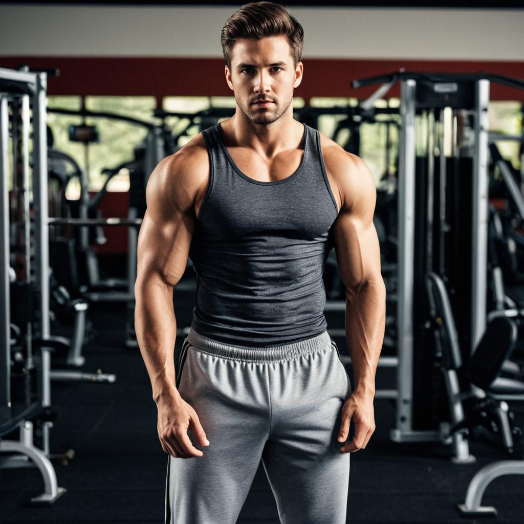 Man gym fashion,male focus, 1boy, watch, muscular, solo, wristwatch, muscular male, facial hair, tank top, bara, short hair, pants, shirt, black pants, grey tank top, pectorals, looking at viewer, veiny arms, gym, large pectorals, undercut, closed mouth, indoors, blurry background, grey shirt
