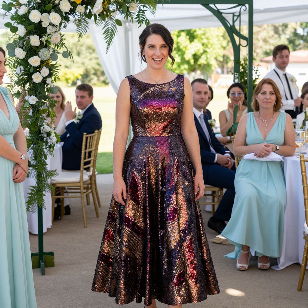 Photograph of a smiling woman in a shimmering, multicolored sequin dress, standing at an outdoor wedding ceremony, surrounded by guests in past
