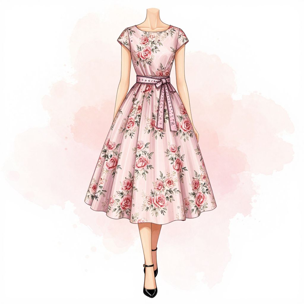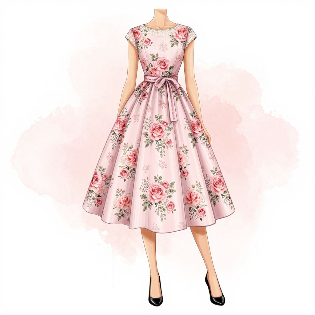A fashion illustration featuring a woman in a light pink floral dress adorned with delicate rose patterns, complemented by a matching belt and black heels, set against a soft watercolor background, showcasing a blend of digital artistry and vintage charm.