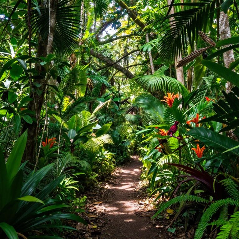 Cayo tropical jungle interior, dense greenery with exotic plants and flowers, winding dirt path through vibrant undergrowth, sunlight filtering through canopy creating dappled light patterns, tropical birds and wildlife hidden in foliage, immersive atmosphere