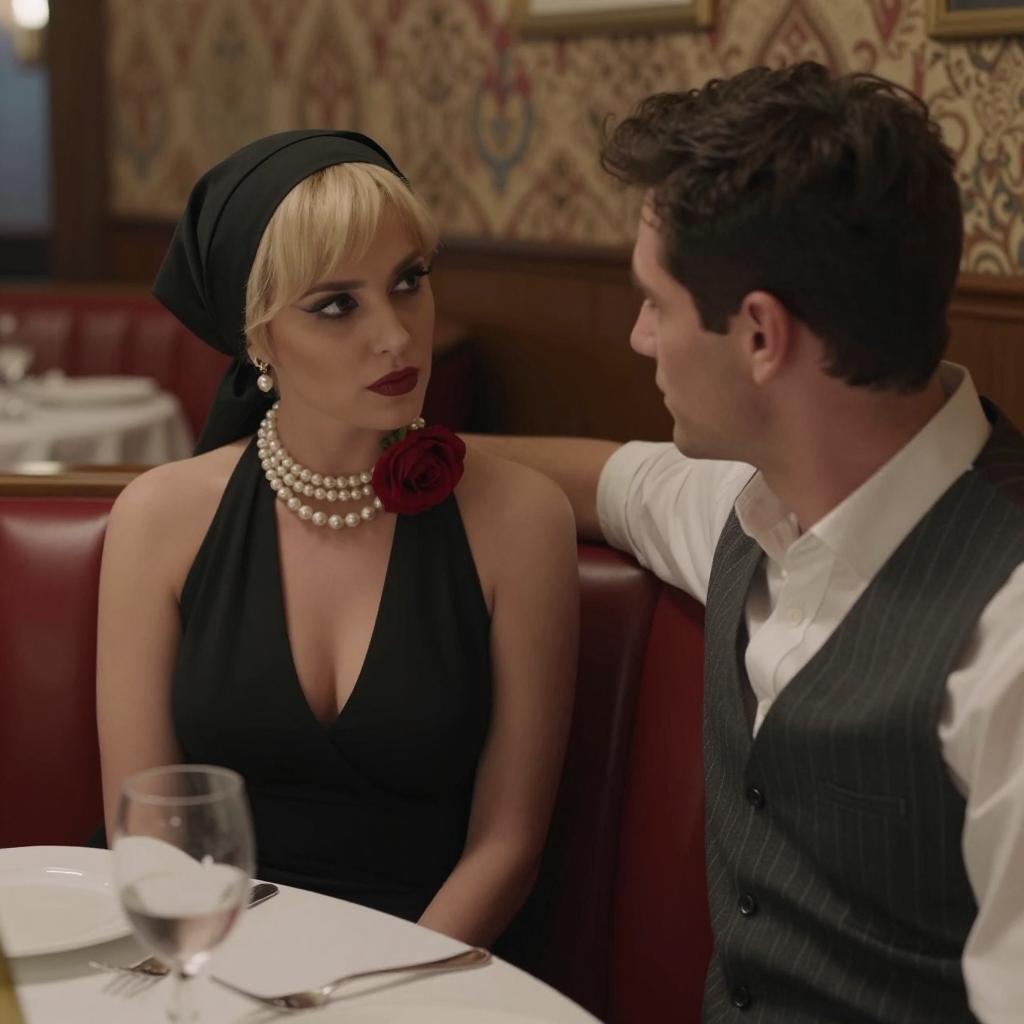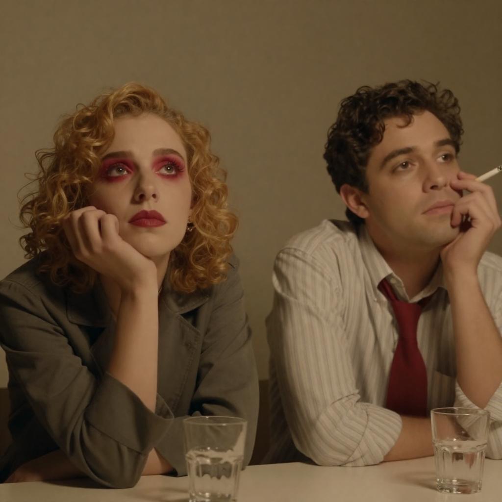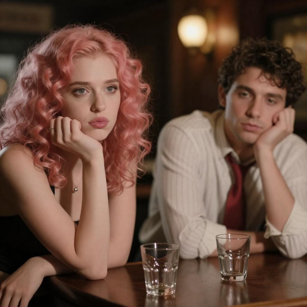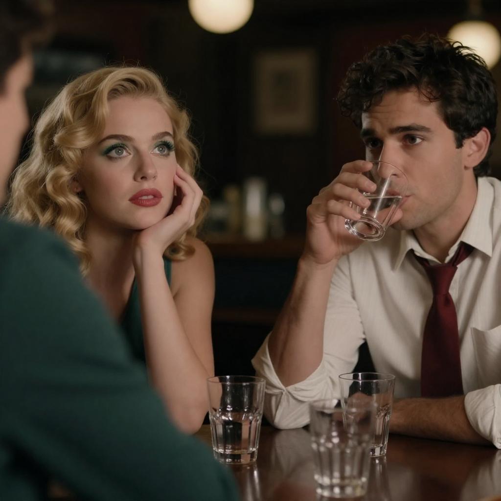 Photograph of a dimly lit bar scene. Blonde woman with curled hair, green eye makeup, hand on cheek, looking up. Dark-haired man in striped shirt, red tie, sipping from glass, leaning forward. Multiple empty glasses on table. Blurred green figure in foreground.