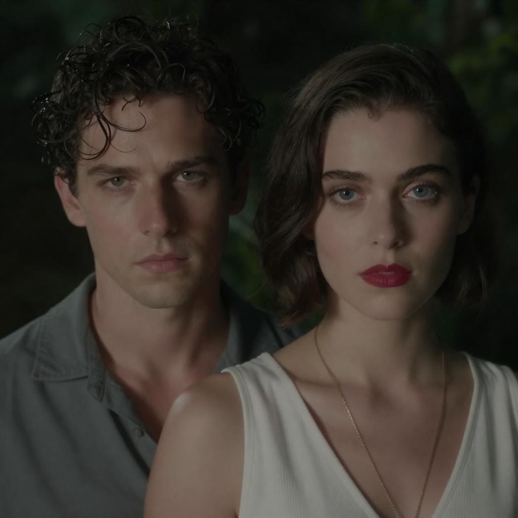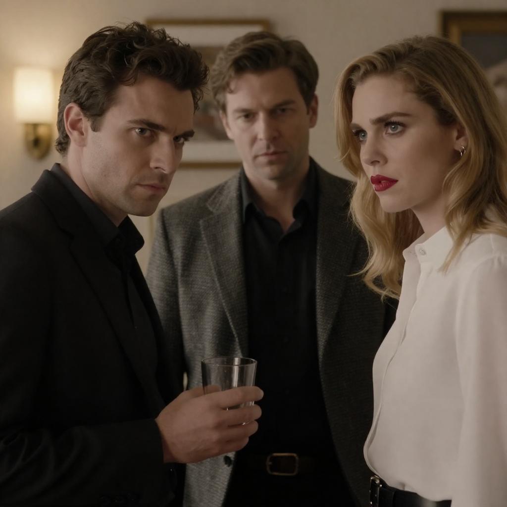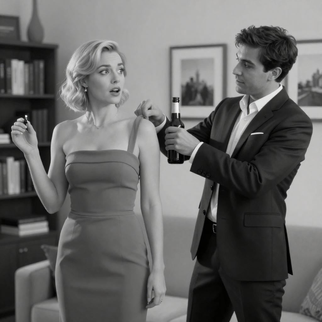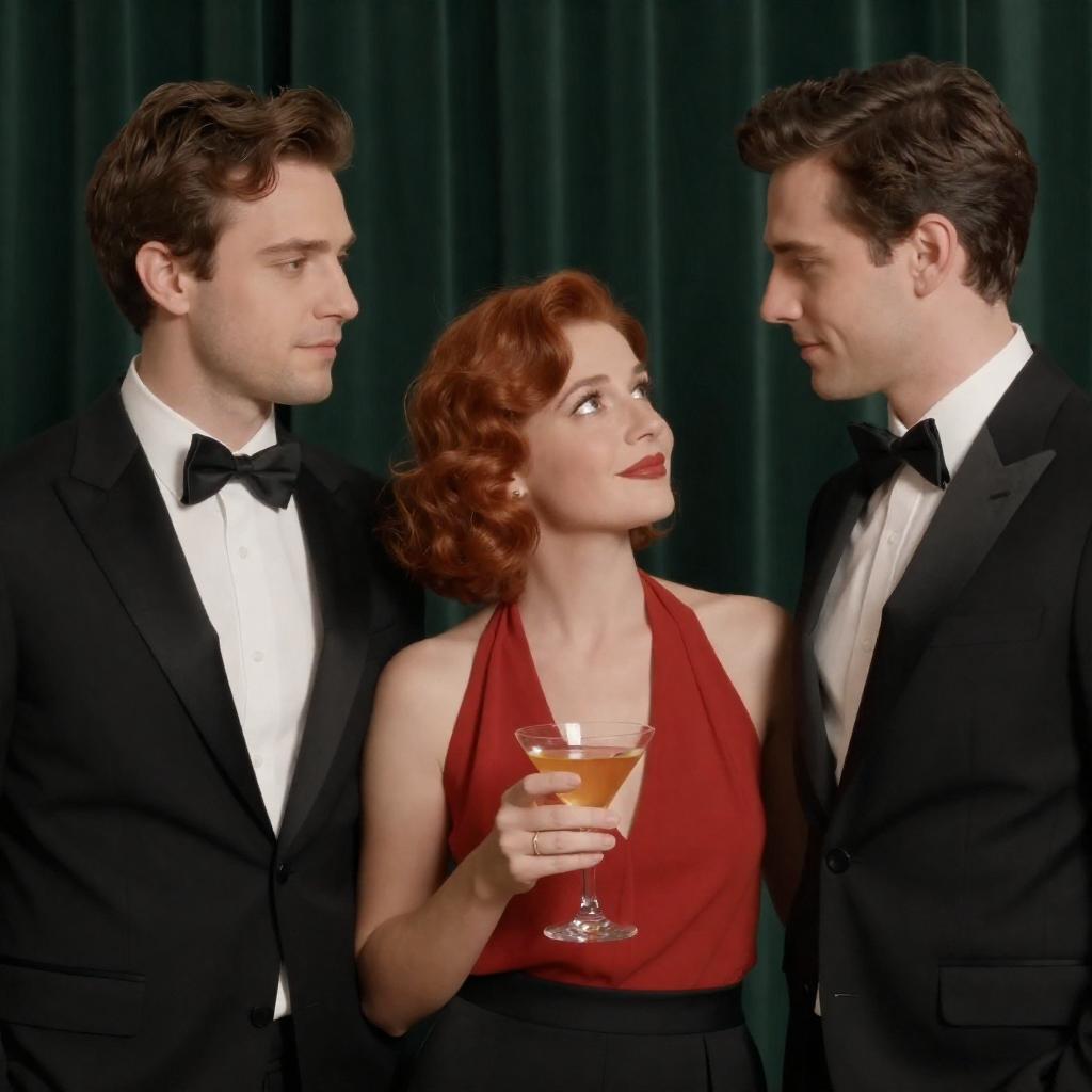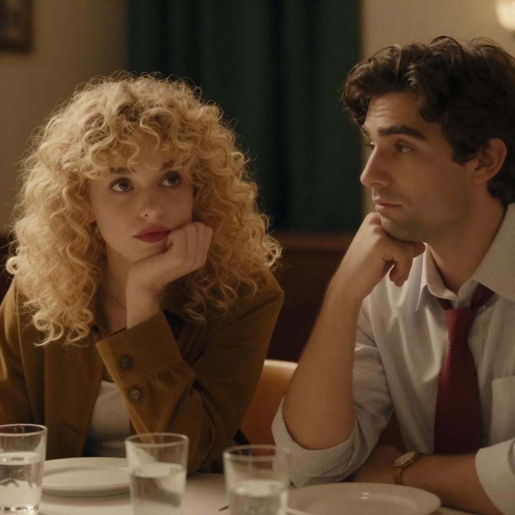 Photograph of a dimly lit bar scene. Blonde woman with curled hair, green eye makeup, hand on cheek, looking up. Dark-haired man in striped shirt, red tie, sipping from glass, leaning forward. Multiple empty glasses on table. Blurred green figure in foreground.