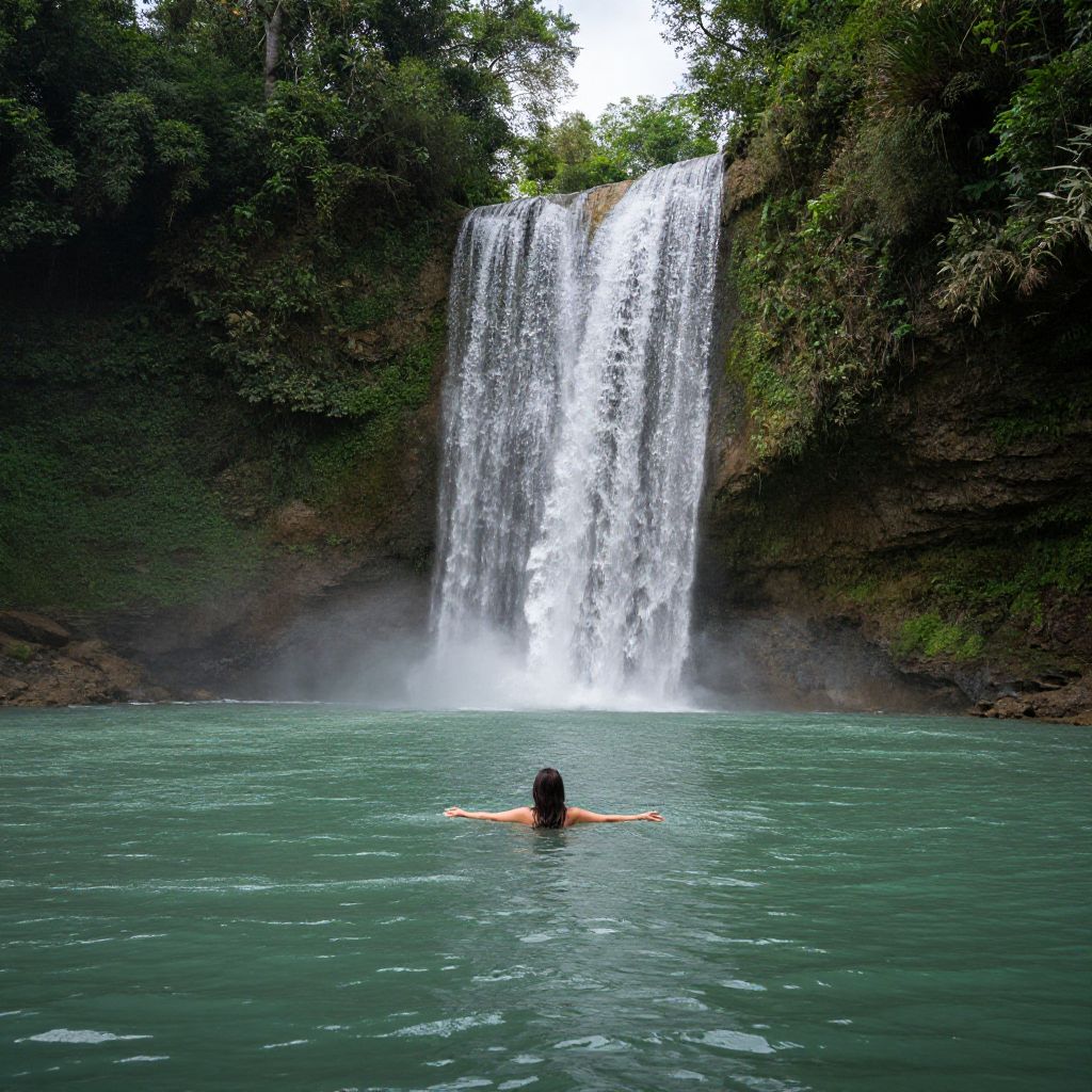 Photograph of a lone person with dark hair swimming in a turquoise pool, facing a tall, cascading waterfall surrounded by dense, lush greenery. The waterfall creates a misty spray at its base, contrasting with the dark, rocky cliffs on either side. The swimmer's back is to the camera, with their arms outstretched. The bright, white water of the waterfall contrasts with the dark green and brown forest background. The scene is serene and natural, with the water's surface reflecting the surrounding greenery.