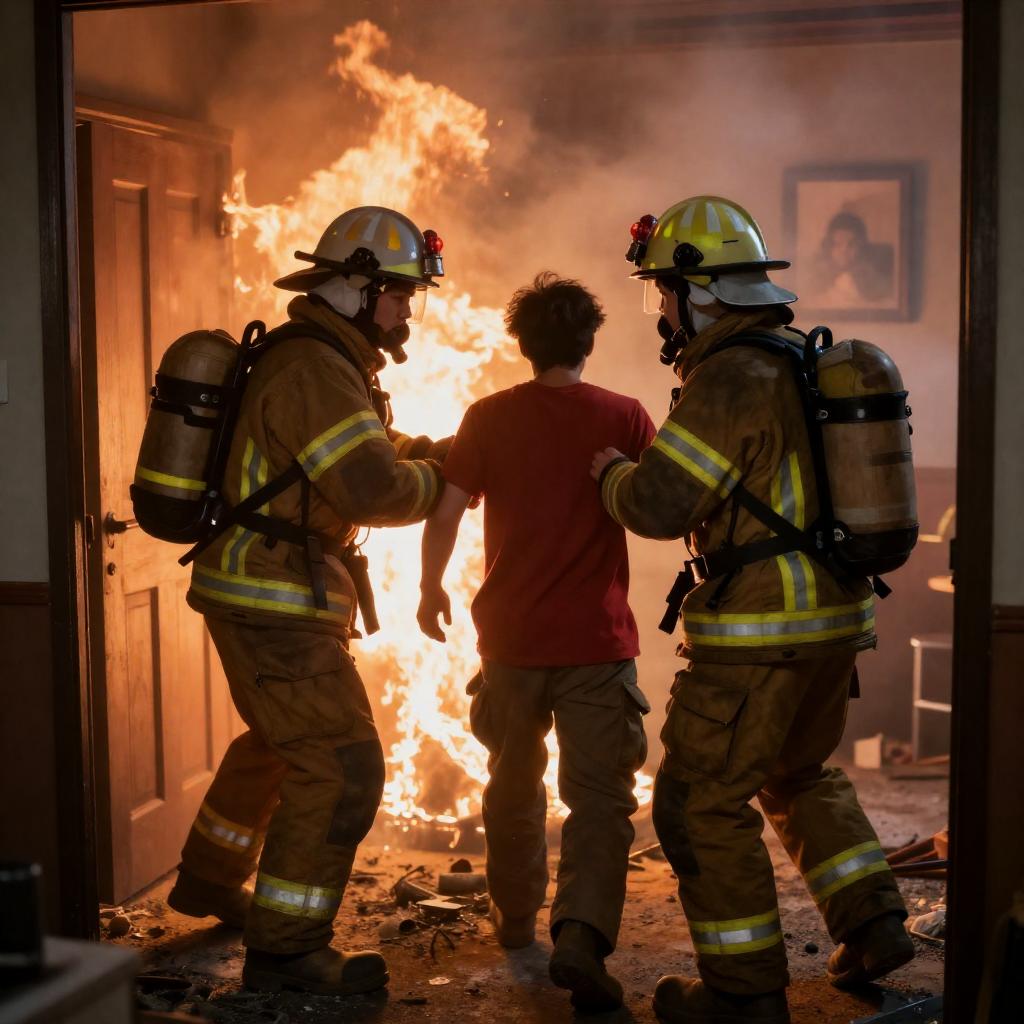 Photograph of two firefighters in full gear, including helmets with red lights, rescuing a person in a red shirt from a burning room. Bright flames and smoke fill the background, with a wooden door and framed picture on the wall. The floor is covered in ash and debris.