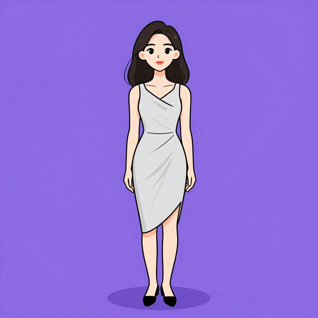 Woman with pretty face and pretty hair. Woman, contemporary, draped cowl neck dress in light grey, sleeveless, subtle asymmetrical hem, above-knee length, black flat shoes, minimalist style, plain studio backdrop. --sref 1461