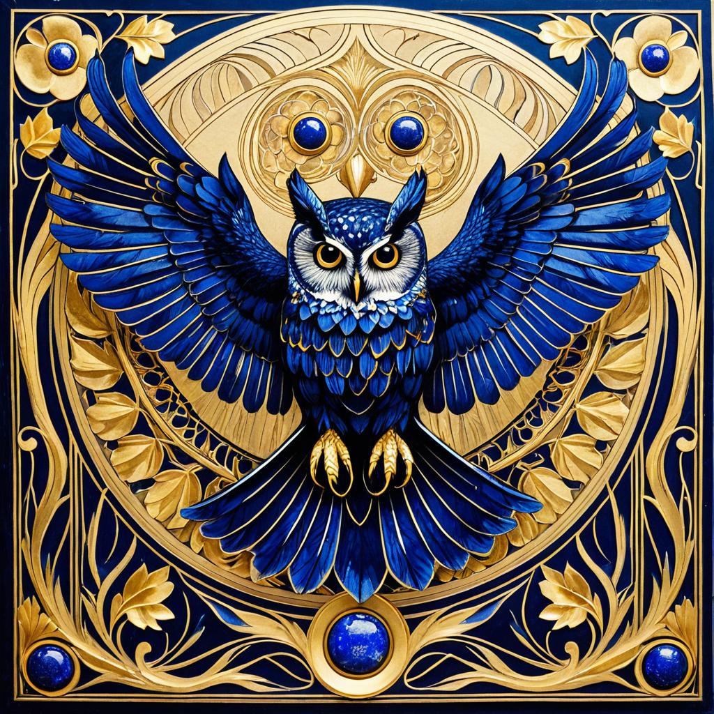 A striking Art Nouveau style design featuring a blue owl with outstretched wings, adorned with intricate gold leaf details and lapis lazuli elements. The composition includes flowing organic shapes, floral motifs, and dynamic patterns that evoke a sense of motion and elegance typical of Art Nouveau aesthetics.