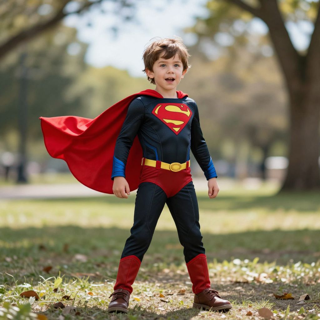 Photograph of a young boy in a Superman costume, red cape blowing, standing in a sunlit park with blurred trees.