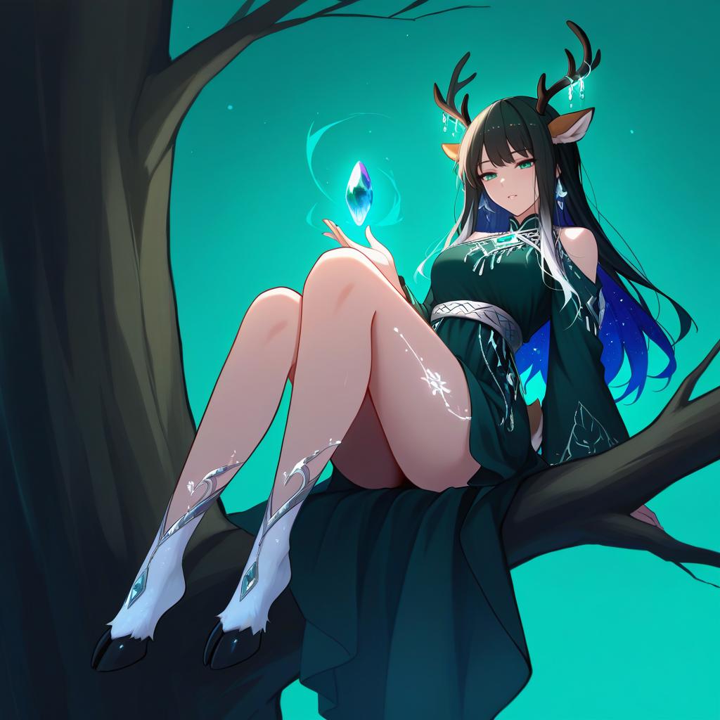 Full body, 1girl, solo, enchanting figure with shimmering skin and starry hair, eyes that shimmer like the night sky, animal ears, antlers, deer tail, hooves, dark green dress with silver accents, detailed clothes, casually reclining against a tree, offering a luminously glowing stone, green background