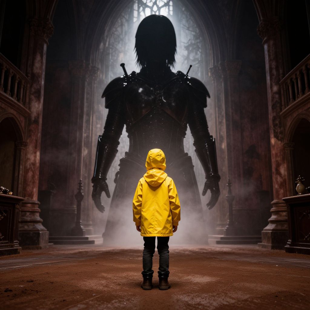 Photograph-like CGI image depicting a child in a bright yellow raincoat standing with their back to the camera, facing a towering, menacing, black, robotic figure with a silhouetted head and armor in a dark, gothic cathedral. The cathedral features tall, arched windows and stone columns, with mist swirling around the floor. The child's raincoat contrasts sharply with the dark, ominous background, emphasizing their small size compared to the towering figure. The scene is dramatic and eerie, with the child appearing vulnerable against the larger, shadowy robot.