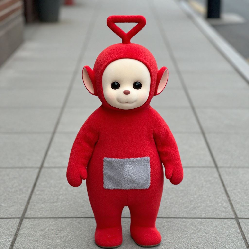 Teletubbies Red Costume, a close up of a child in a red costume standing on a sidewalk