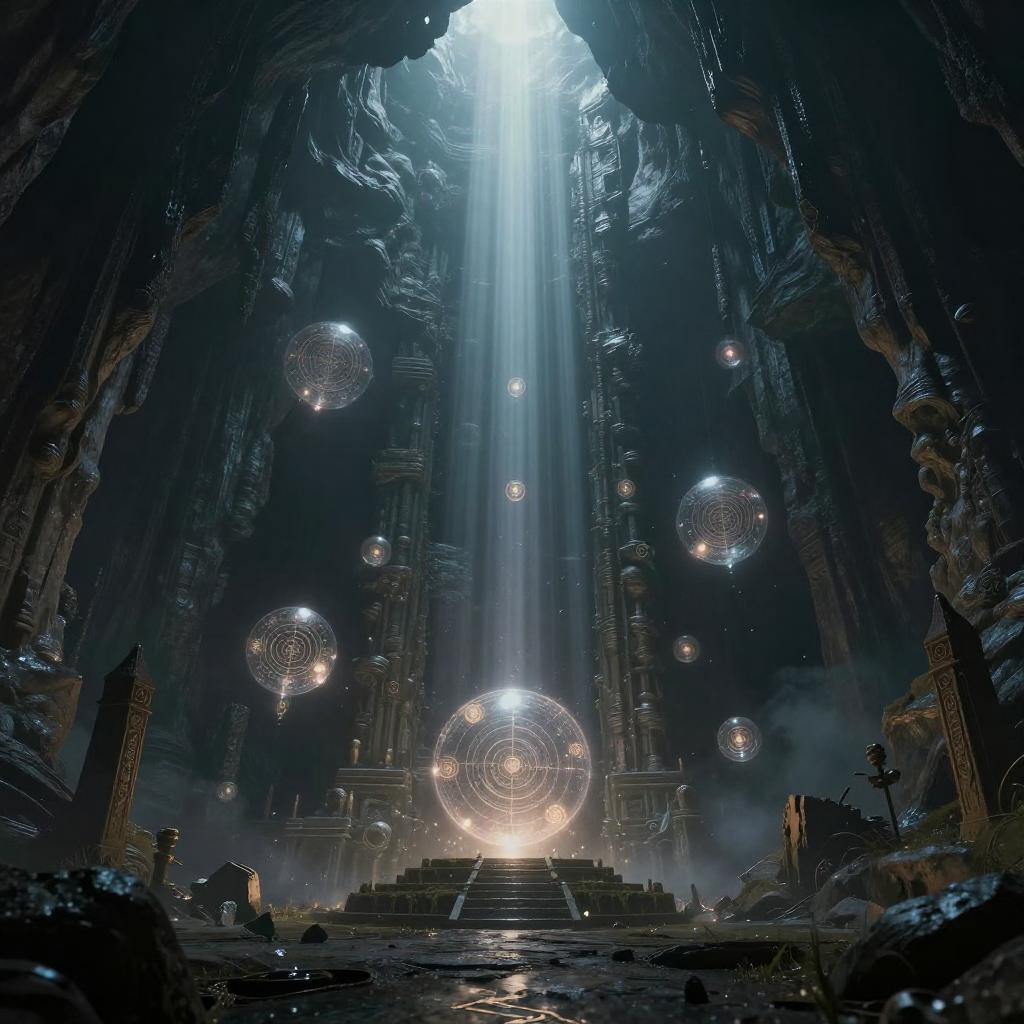 Arcane abyss mysterious dark cavern filled with ethereal light beams, floating magical orbs and ancient ruins, dark fantasy environment with glowing magical sigils